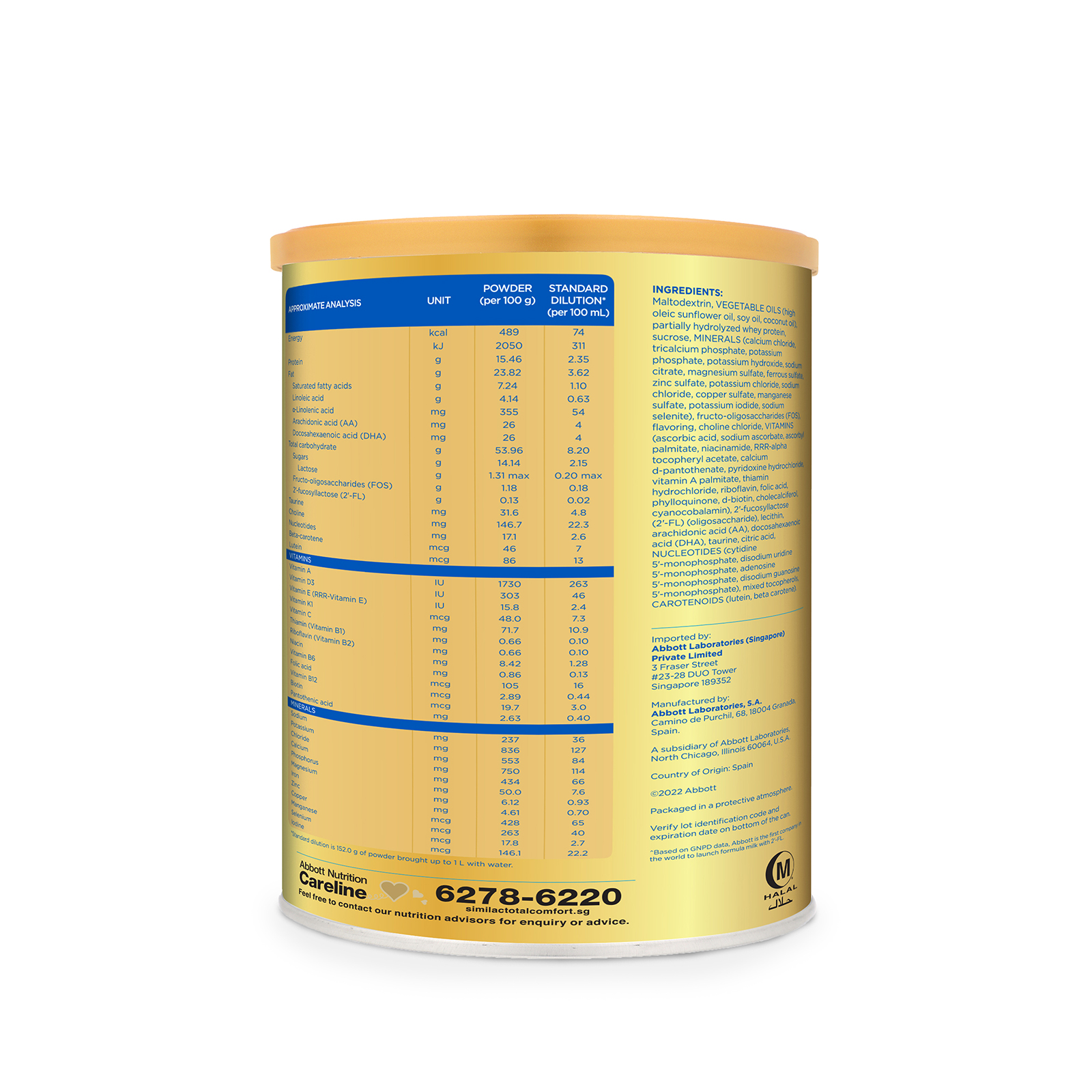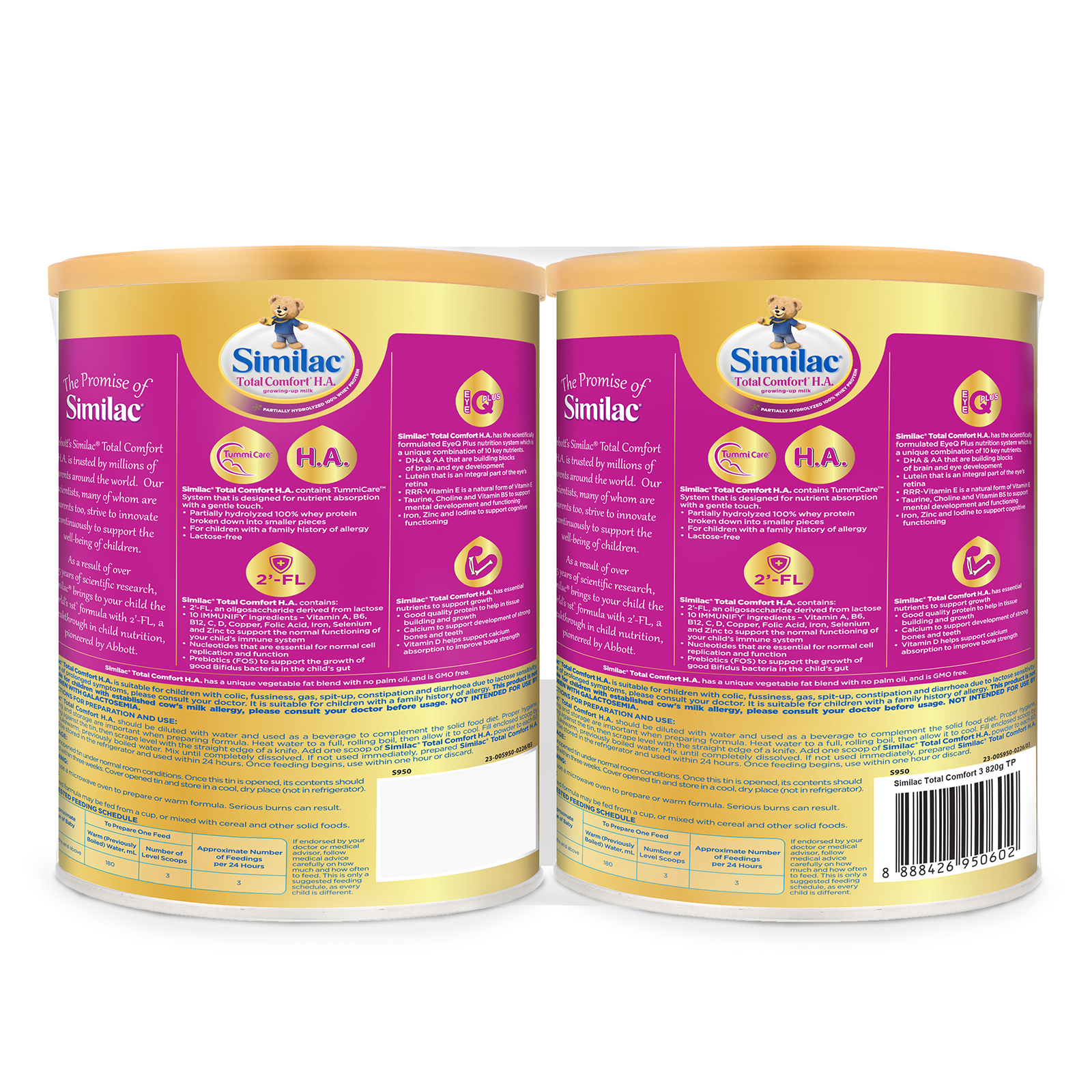 1. Thoroughly wash feeding bottle, nipple, cap and all utensils to be used in preparing the feeding. 2. After rinsing soap from the utensils, boil them for 5 minutes. 3. Provide clean surface on which to prepare the formula. 4. In a separate pan, heat water to a rolling boil for 5 minutes and allow it to cool. 5. Pour the correct amount of warm, previously boiled water into the sterilized feeding bottle. 6. Fill enclosed scoop, then scrape level with the straight edge of a knife. 7. Add one level scoop of Similac Total Comfort to each 60mL of water in bottle. 8. Mix until completely dissolved. Test temperature and feed. 9. Discard unused formula within 1 hour.