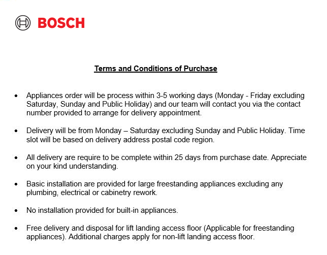 Appliances order will be process within 3-5 working days (Monday - Friday excluding Saturday, Sunday and Public Holiday) and our team will contact you via the contact number provided to arrange for delivery appointment.