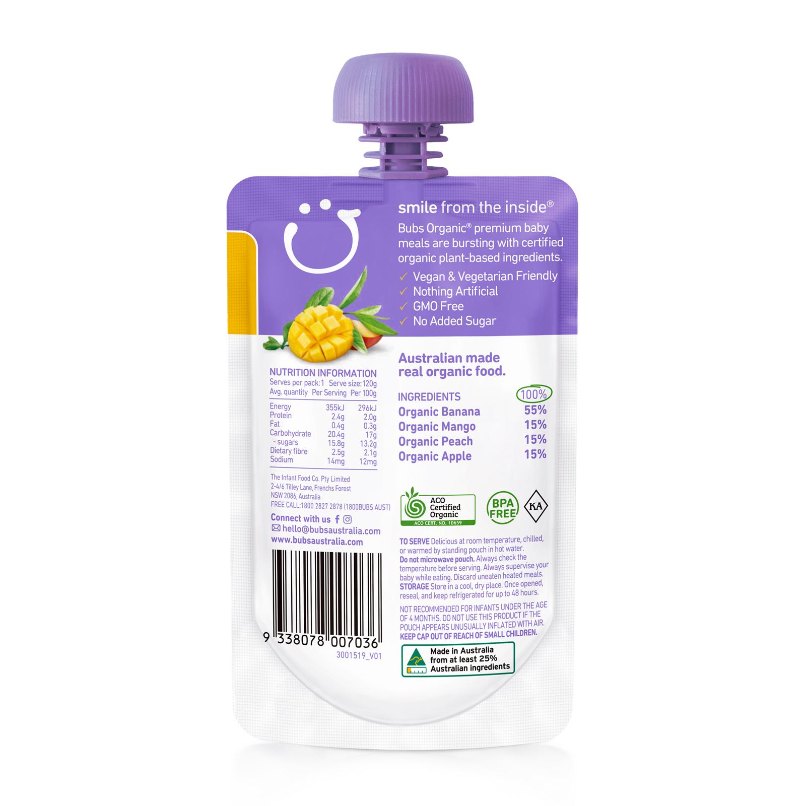Organic Banana 45%, Organic Mango 15%, Organic Peach 15%, Organic Apple 15%, Water 10%, Vitamin C < 1%.