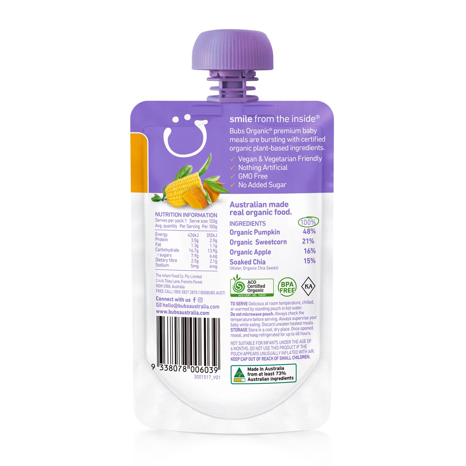 Organic Pumpkin 45%, Organic Sweetcorn 20%, Soaked Chia (Water, Organic Chia Seeds) 20%, Organic Apple 15%, Vitamin C < 1%.