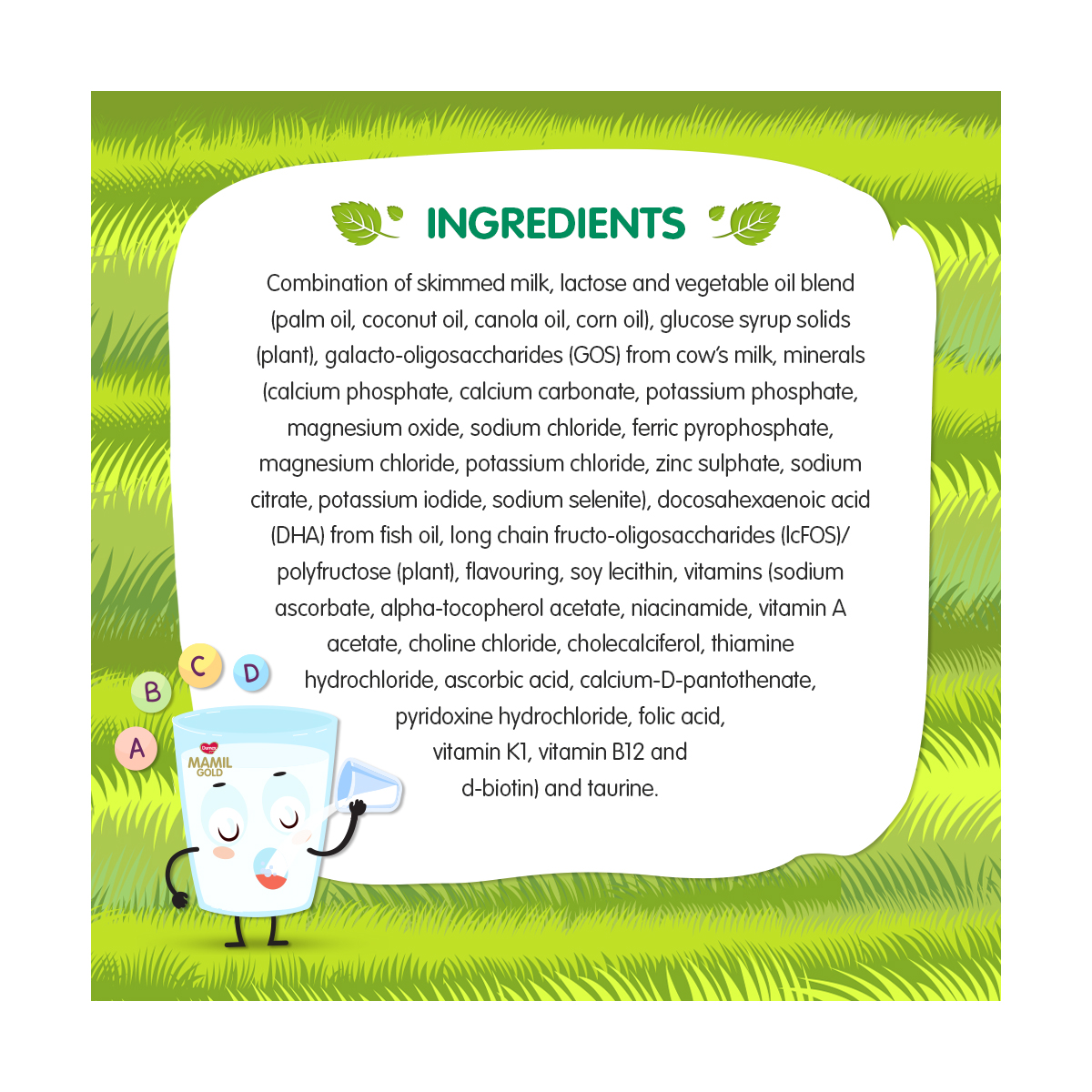 Combination of skimmed milk, lactose and vegetable oil blend (palm oil, coconut oil, canola oil, corn oil), glucose syrup solids (plant), galacto-oligosaccharides (GOS) from cow’s milk, minerals (calcium phosphate, calcium carbonate, potassium phosphate, magnesium oxide, sodium chloride, ferric pyrophosphate, magnesium chloride, potassium chloride, zinc sulphate, sodium citrate, potassium iodide, sodium selenite), docosahexaenoic acid (DHA) from fish oil, long chain fructo-oligosaccharides (lcFOS)/ polyfructose (plant), flavouring, soy lecithin, vitamins (sodium ascorbate, alpha-tocopherol acetate, niacinamide, vitamin A acetate, choline chloride, cholecalciferol, thiamine hydrochloride, ascorbic acid, calcium-D-pantothenate, pyridoxine hydrochloride, folic acid, vitamin K1, vitamin B12 and d-biotin) and taurine.
