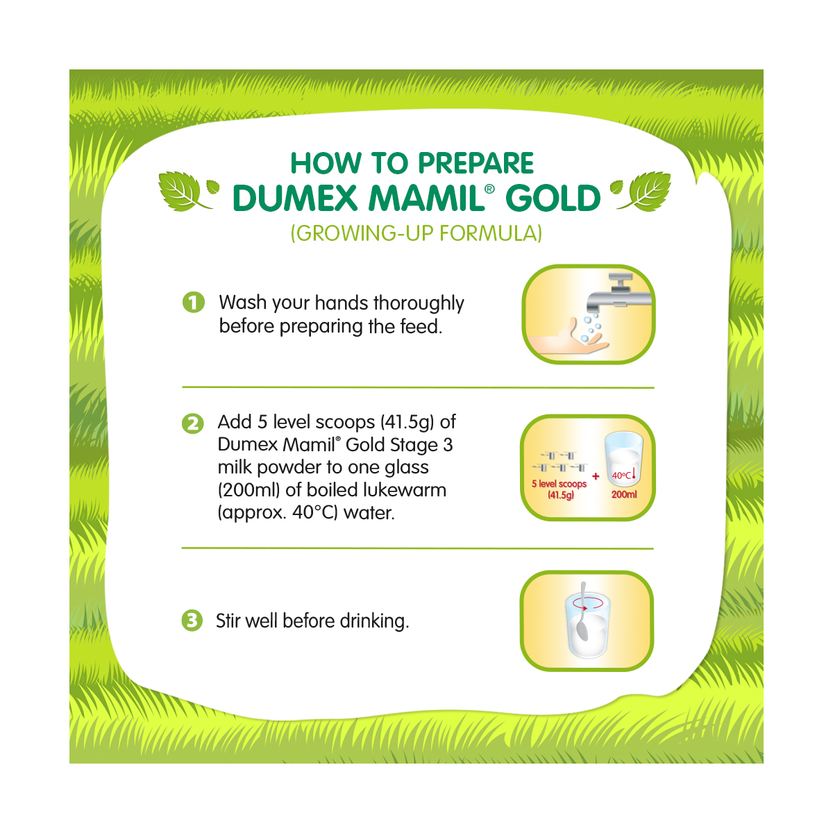 Add 5 level scoops (41.5g) of Dumex Mamil Gold Stage 3 Growing Up Formula to one glass (200ml) of boiled lukewarm (approx. 40 degree C) water. Stir well before drinking.1. Wash your hands thoroughly before preparing the feed.2. Wash, and then boil cleaned bottle, cap, teat or cup in clean drinking water for 10 minutes.3. Boil drinking water for 5 minutes, let it cool until 40 degree C.4. Pour correct amount of previously boiled lukewarm (40 degree C) water into the bottle.5. Add correct number of scoops, levelled off of Dumex Mamil Gold Stage 3.6. Cap bottle and shake bottle gently until the powder dissolves. Reminder- Discard unused feed.
