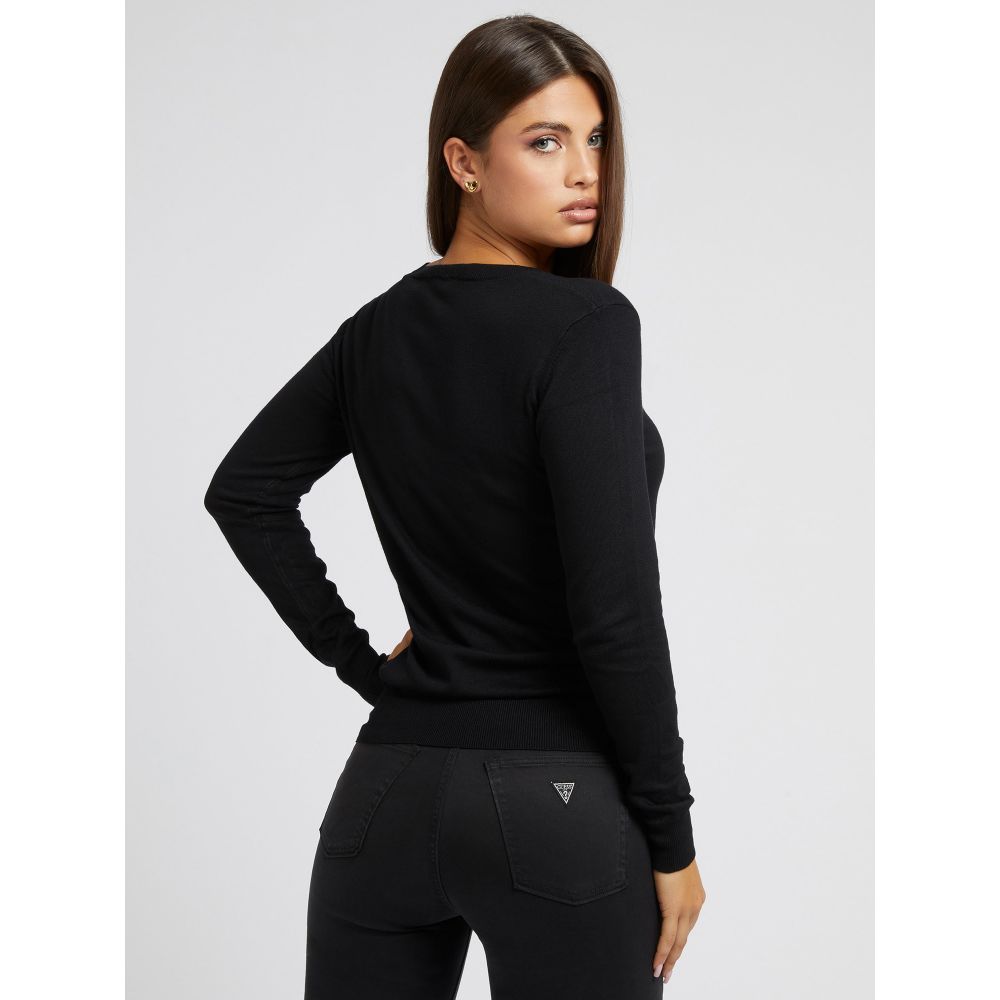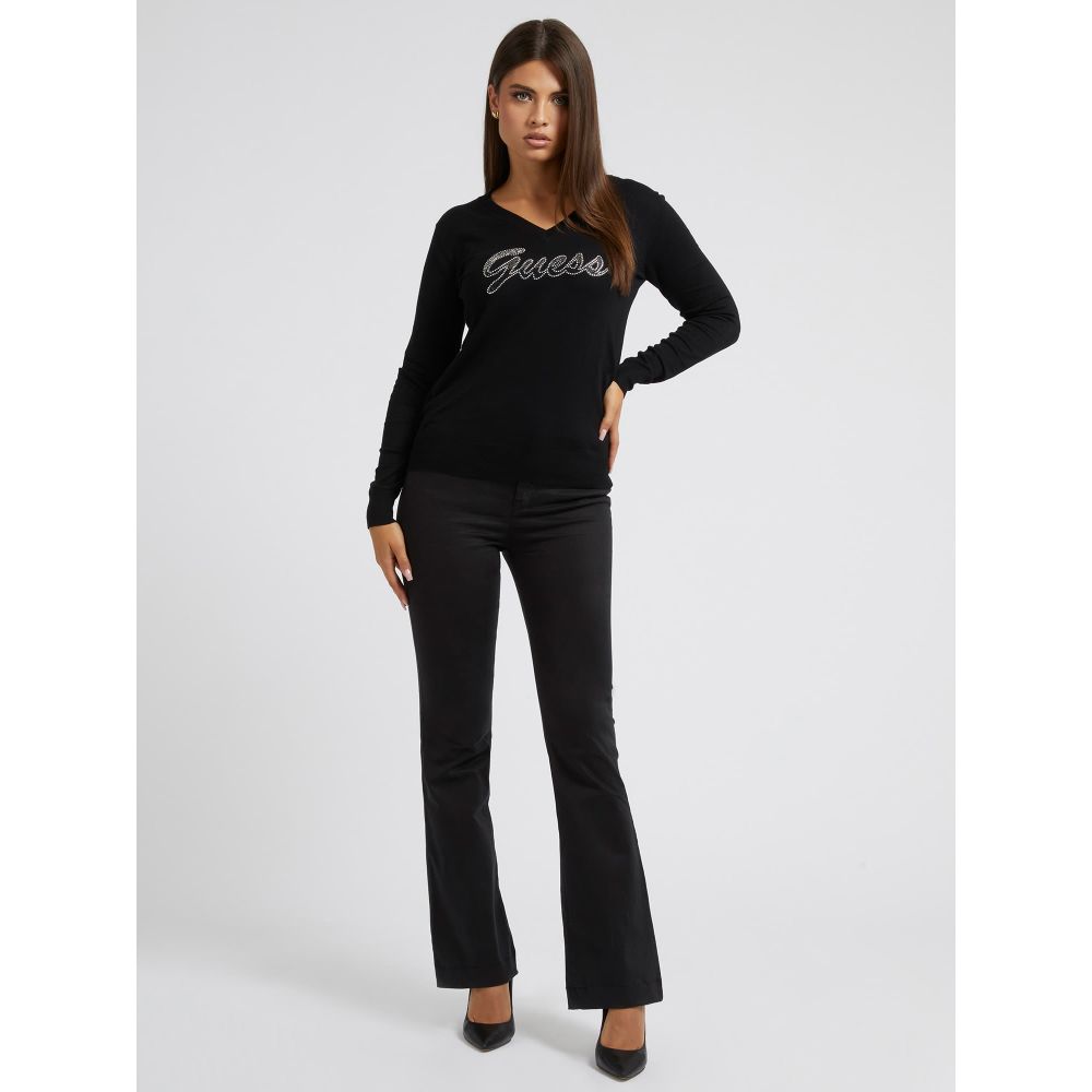 Glam up your cold-weather look with this sweater featuring a front logo, V-neckline and long sleeves.
