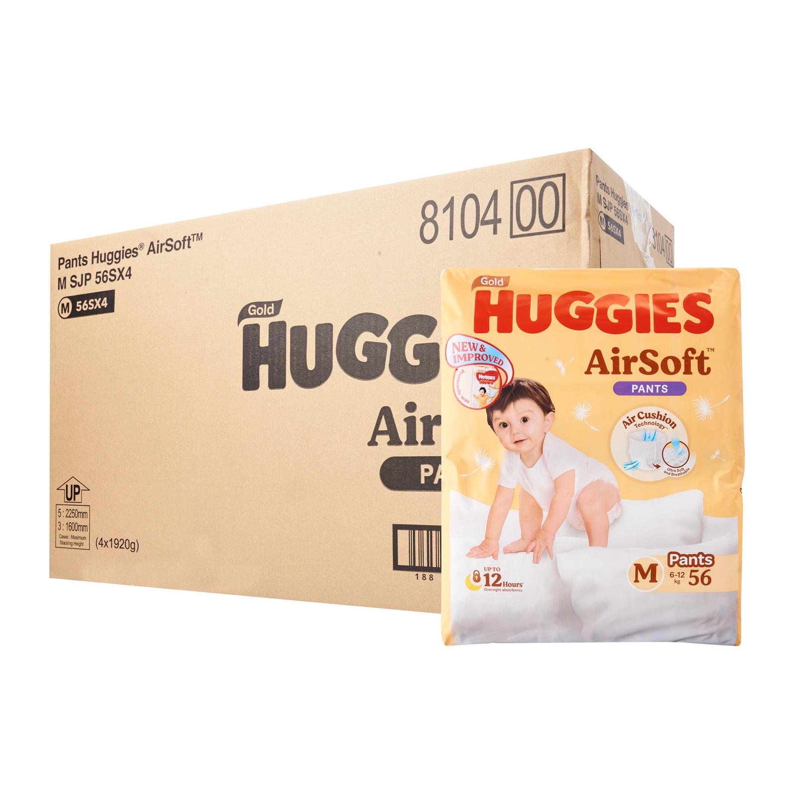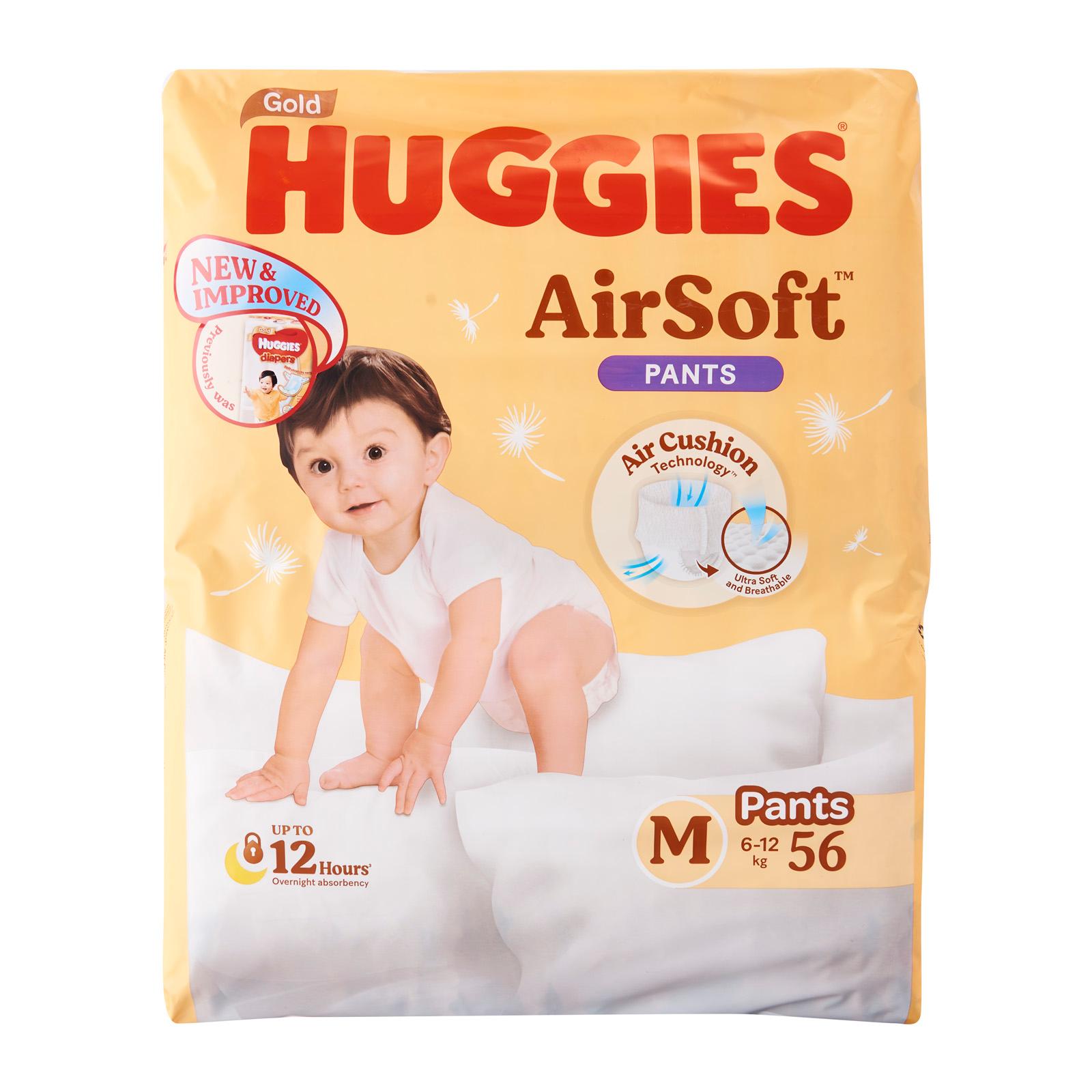 New Improved Huggies Gold Pullup Pants Air Cushion Technology Ultra Soft Breathable Patented Air Cushiontm Technology Specially Designed With 500 3D Air Bubbles Gently Cocoons Baby's Skin And Helps In Stronger Absorption Up To 12 Hours Overnight Absorbency Absorbs All-Night Long To Keep Baby's Skin Dry Comfortable Ultra Soft 360 Waistband For A Soft And Snug Fit Just Like A Mum's Hug Products Available:Huggies Airsoft Pants M 56SHuggies Airsoft Pants L 44SHuggies Airsoft Pants Xl 38SHuggies Airsoft Pants Xxl 38S.