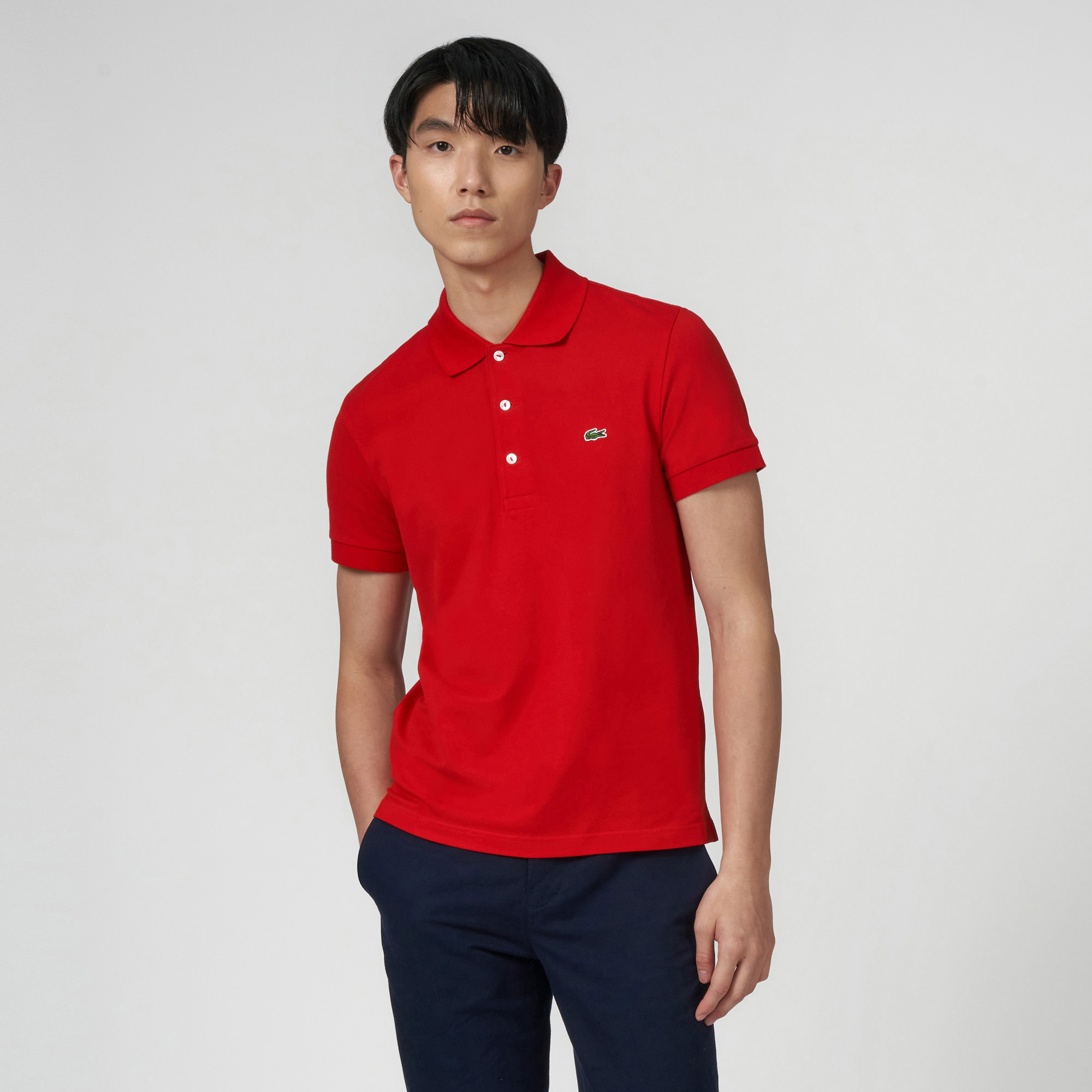 Three-button ribbed polo collarSlim fitRibbed sleeve endsEmbroidered green crocodile on chest