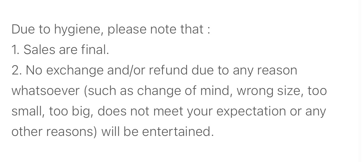 2. No exchange and/or refund due to any reason whatsoever (such as change of mind, wrong size, too small, too big, does not meet your expectation or any other reasons) will be entertained.