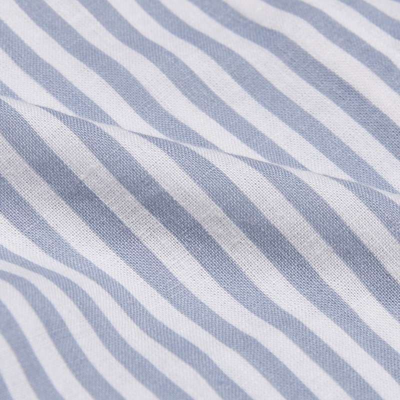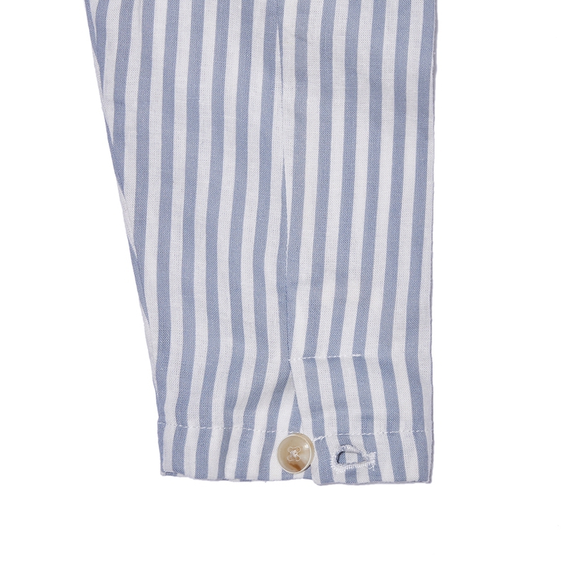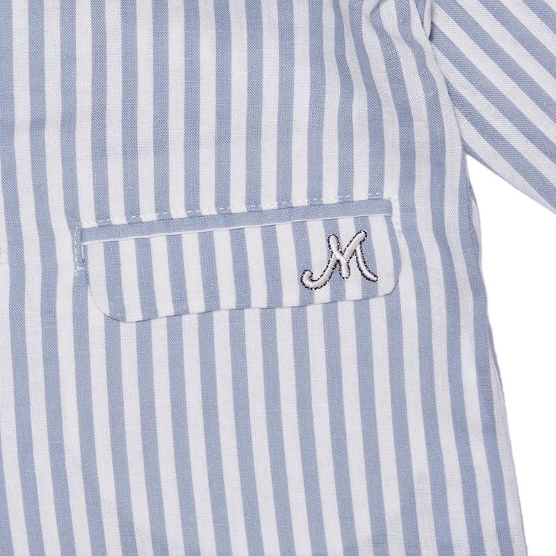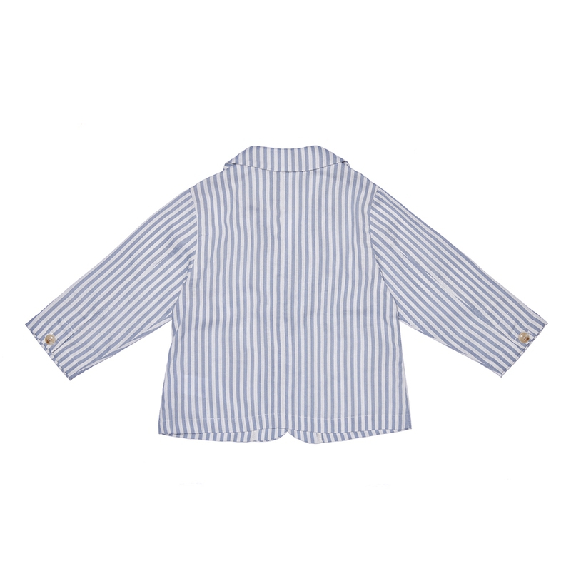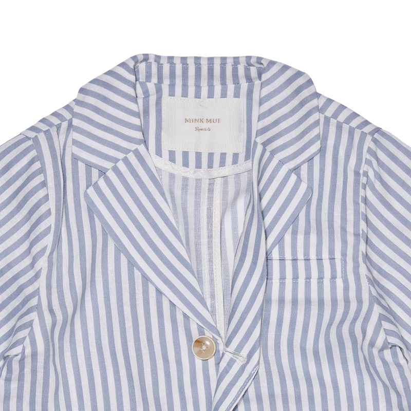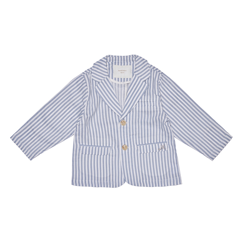 This striped jacket features a luxurious blue color. The elegant gold pearl fabric and embroidery add a special touch and feel soft against the skin.