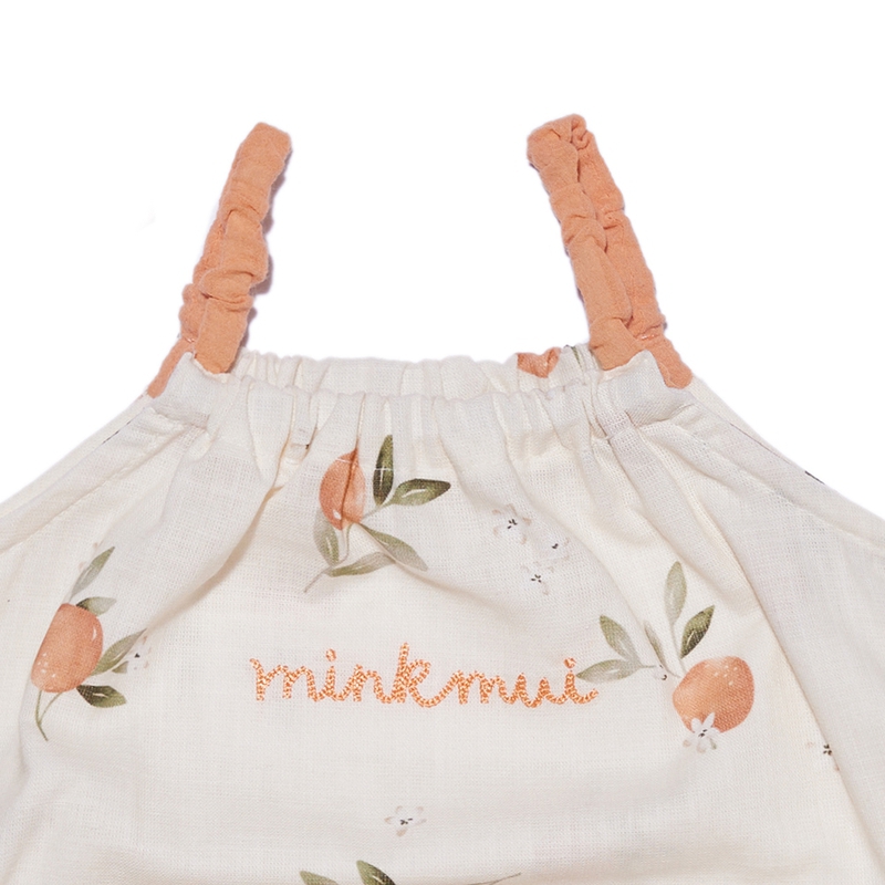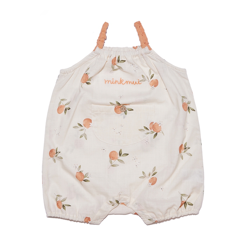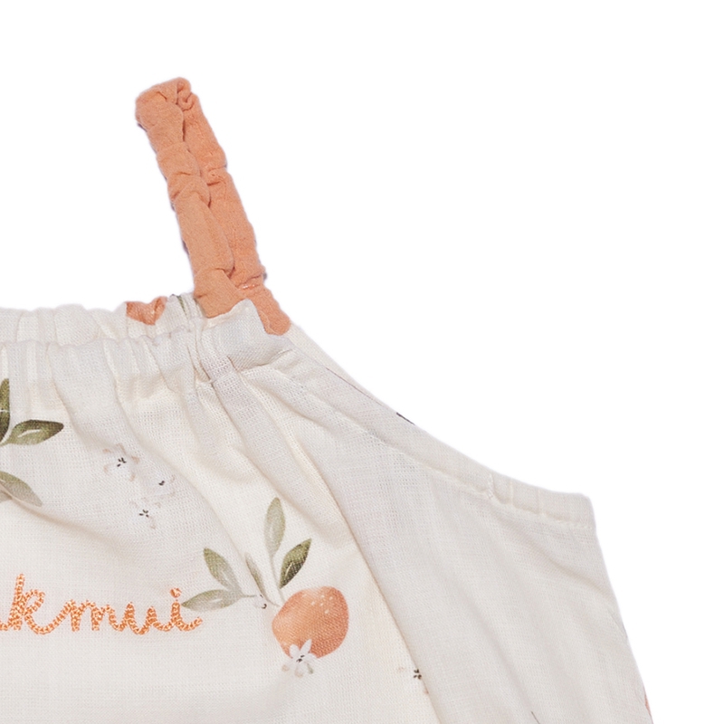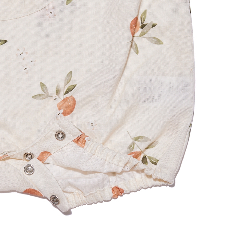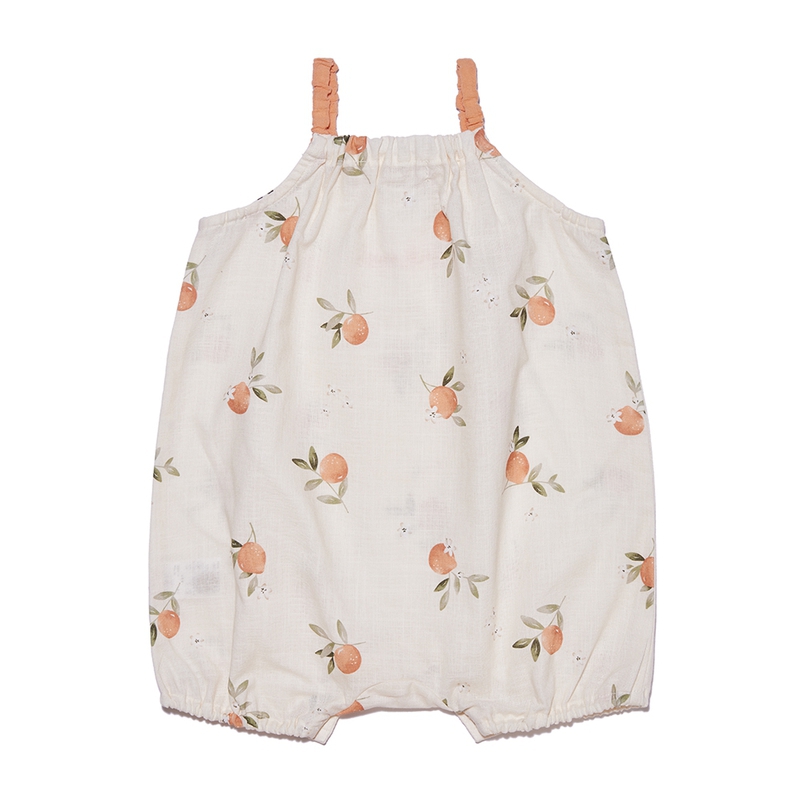 This sleeveless baby bunting bodysuit features a neat ivory base and a pop orange pattern. Adorned with orange-colored rabbit bonnet, it adds a cute touch to the design. Made of cool woven fabric, it ensures that the baby stays comfortable and cool during the summer months.