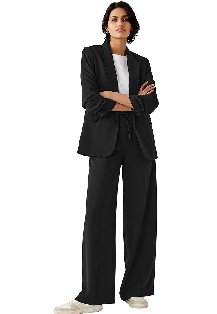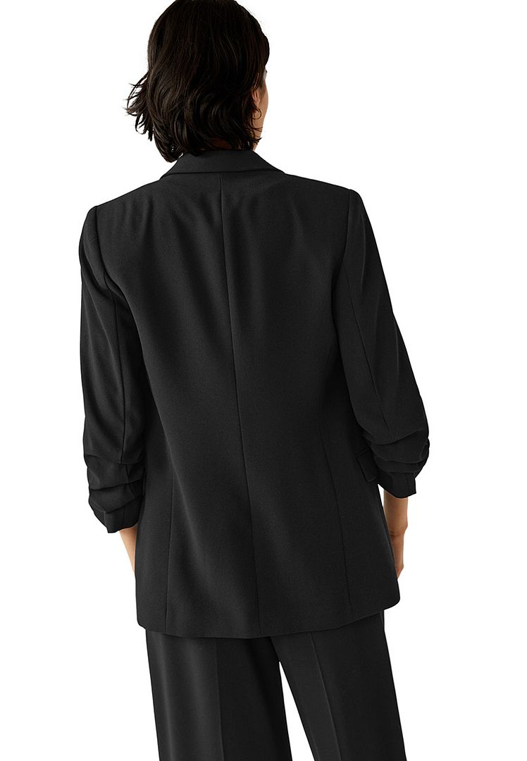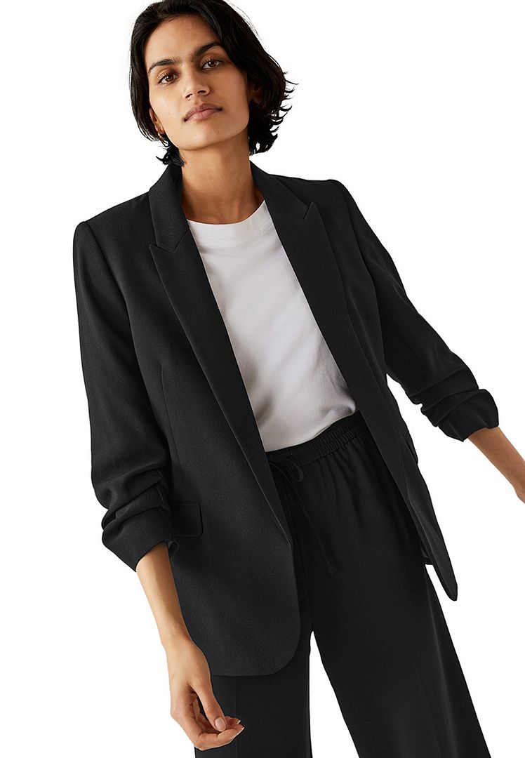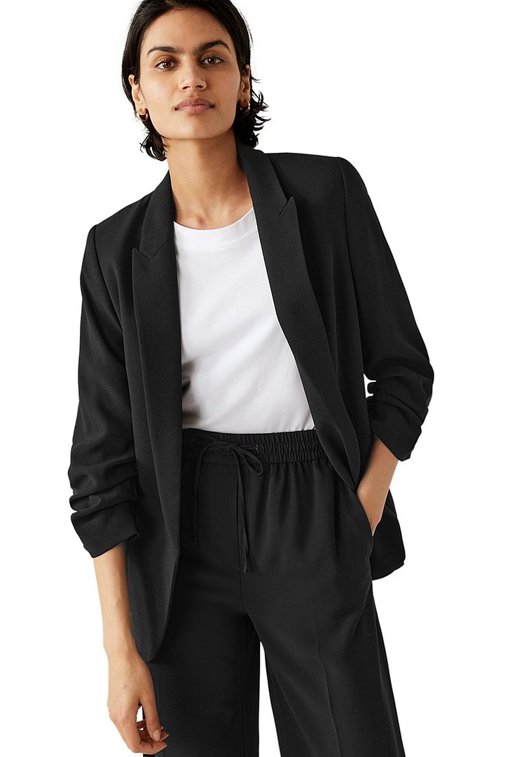 Throw on this easy-to-wear crepe blazer to instantly smarten up on casual days. Designed in a laid-back relaxed fit with 3/4 length ruched sleeves. Edge-to-edge design with no fastenings. Flap pockets and peaked lapels. Fully lined for comfort.Product Style: Relaxed fit, Lined, Fabric Source: Lapel shapeMaterial Composition: 100% polyester, Lining - 55% polyester, 45% viscoseCare instructions: Machine washable even at 30º