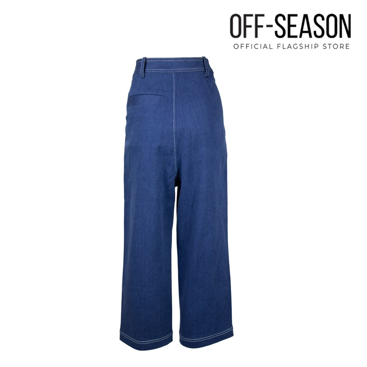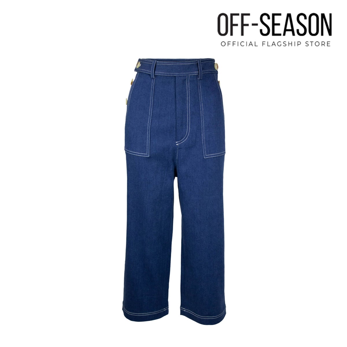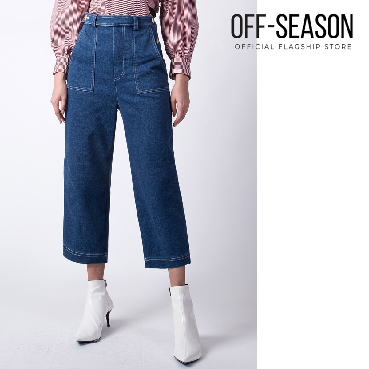 Cropped denim pants in blue High waist Black stitch detail Wide-leg style Regular fit