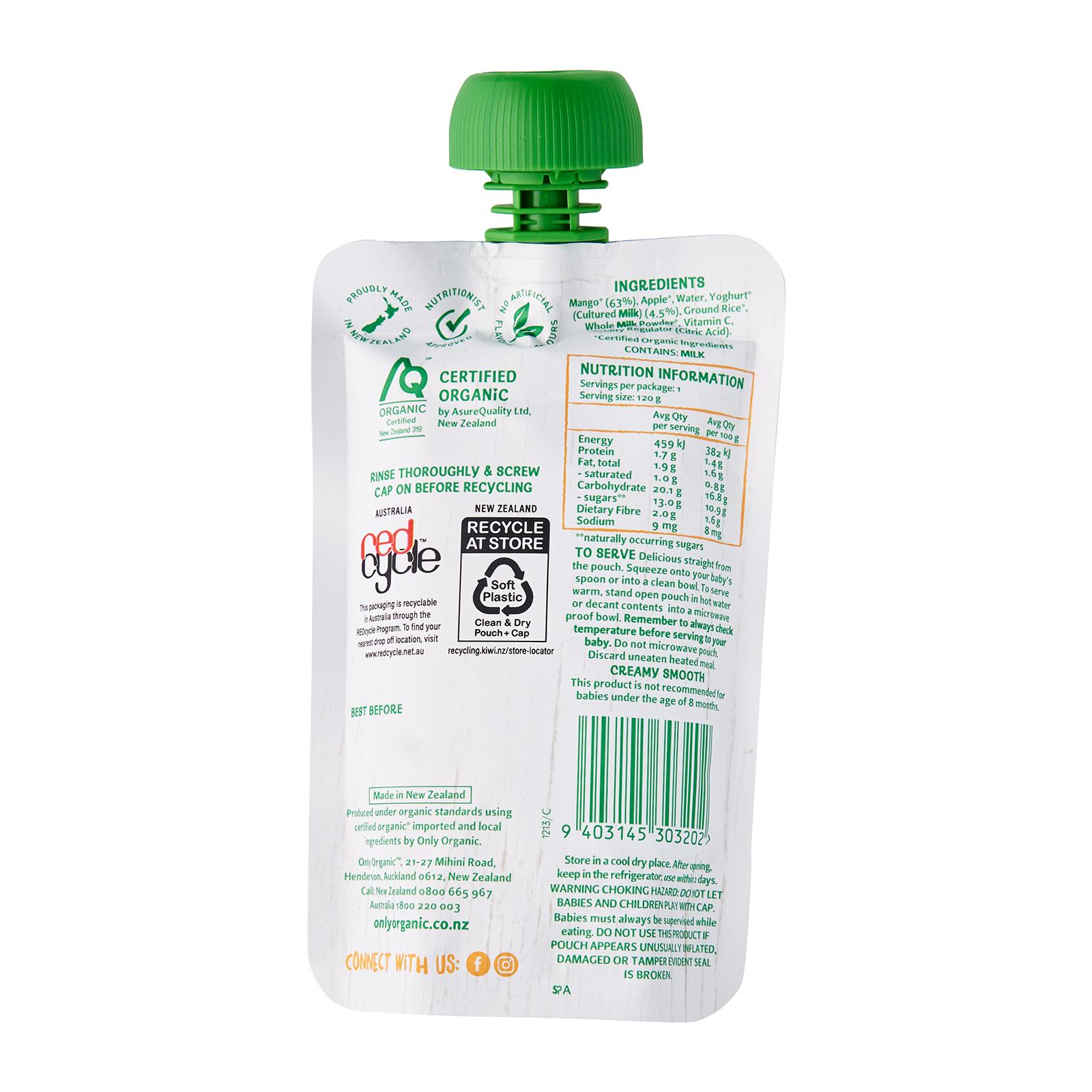 ORGANIC INGREDIENTS: Mango* (59%), Apple*, Water, Yoghurt* (Cultured Milk) (5%), Ground Rice*, Whole Milk Powder*, Acidity Regulator (Citric Acid), Vitamin C, Emulsifier (Soy Lecithin). *Certified Organic Ingredients *Contains milks and soy.
