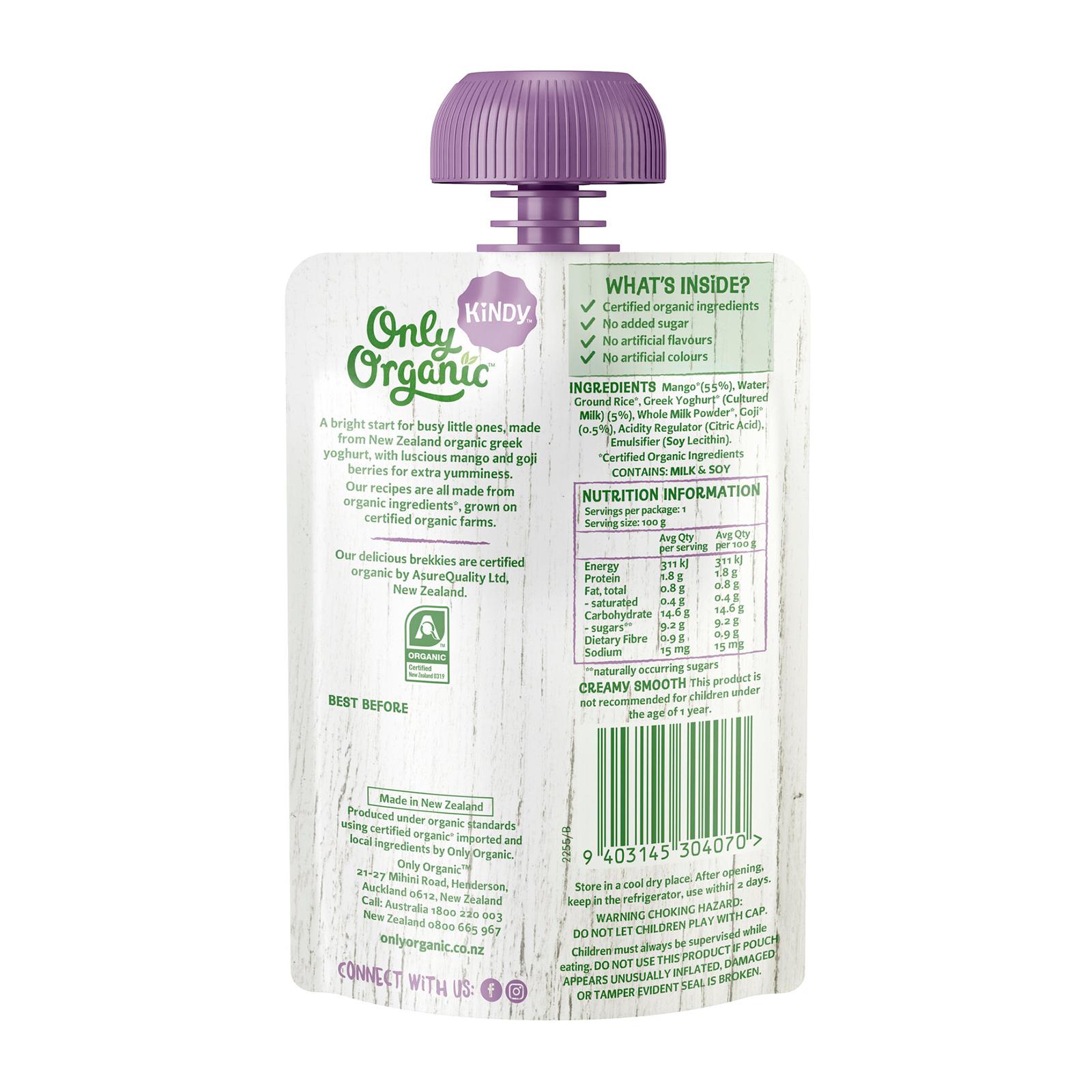 ORGANIC INGREDIENTS: Mango*(55%), Water, Ground Rice*, Greek Yoghurt* (Cultured Milk) (5%), Whole Milk Powder*, Goji* (0.5%), Acidity Regulator (Citric Acid), Emulsifier (Soy Lecithin). *Certified Organic Ingredients *Contains milk and soy.