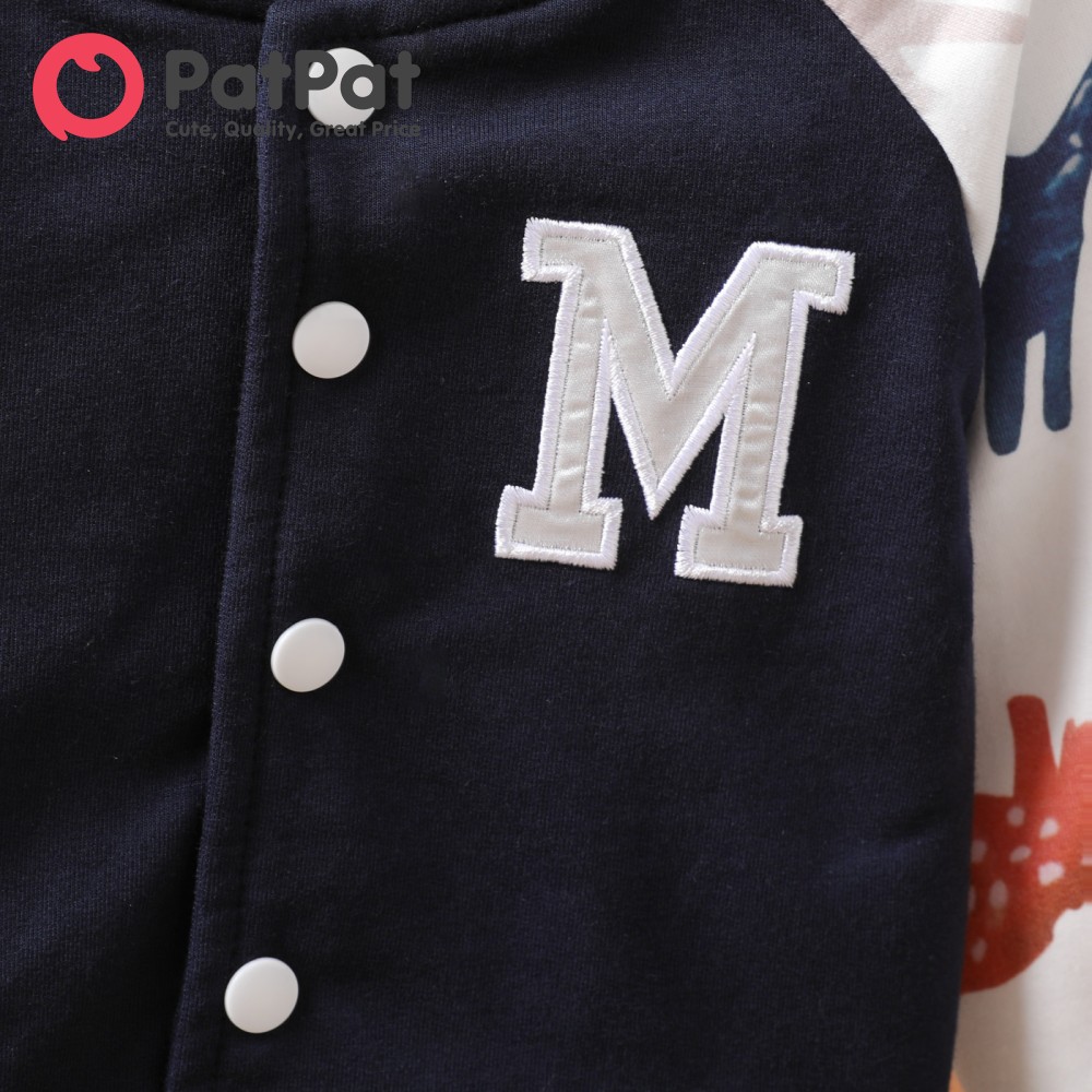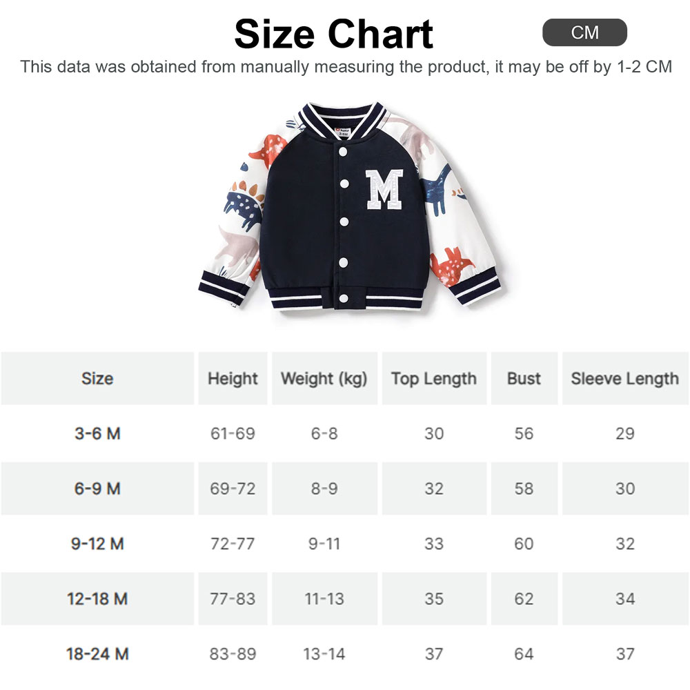 Product Introduction: Cute dinosaur printed sporty baseball jacket for your little one, perfect for daily outings in autumn. Fabric: Made with moderate material, including fabric patchwork. Composition ratio - 70% cotton and 30% polyester. Care Instruction: Machine wash cold and tumble dry low. Key Features: * Product features: Long sleeves, stand collar, and front zipper
