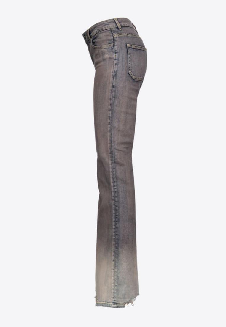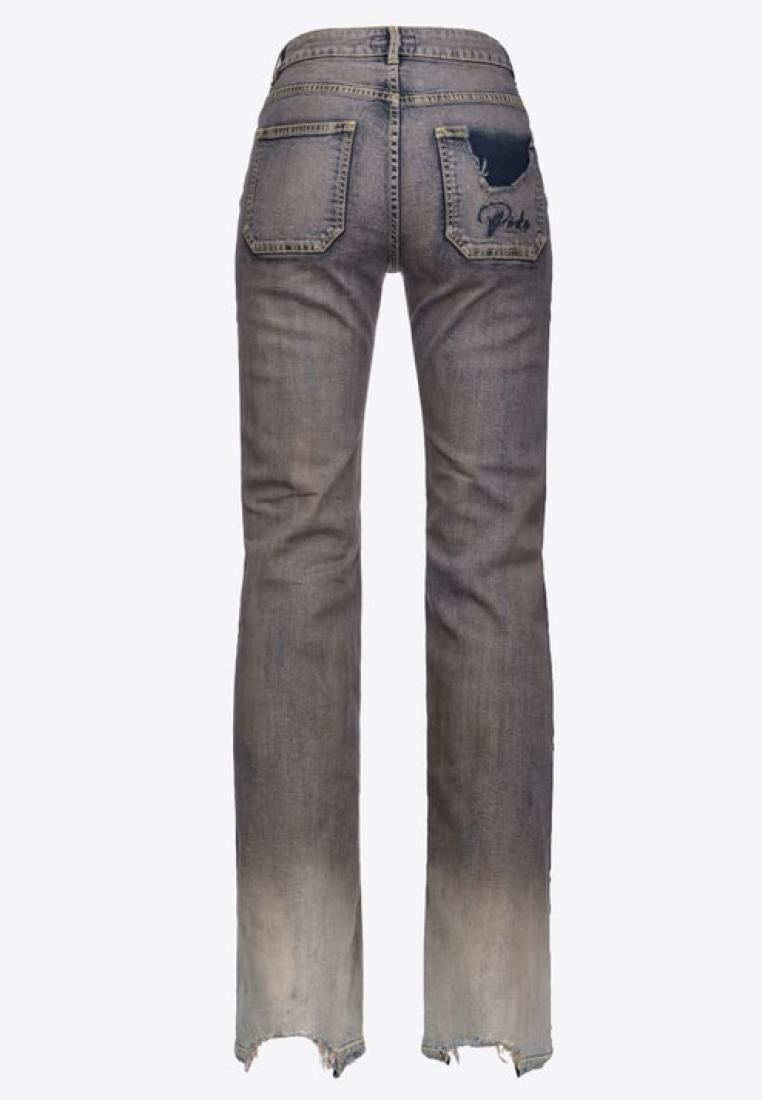 Five-pocket, straight-cut jeans in overdyed comfort denim with special fade effect. Mid-rise waist with belt loops, straight legs, lighter colour at the bottom and frayed hems. Washed and complete with an embroidered PINKO logo, one of the rear pockets has a frayed, ripped effect. Zip and tack-button fastening..