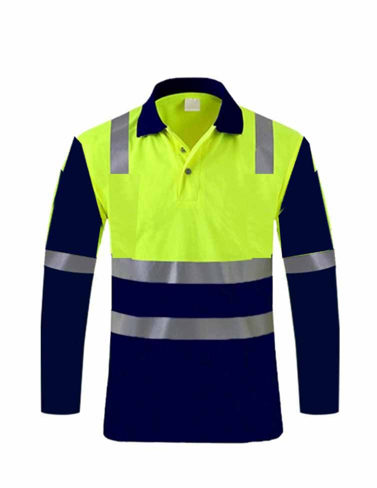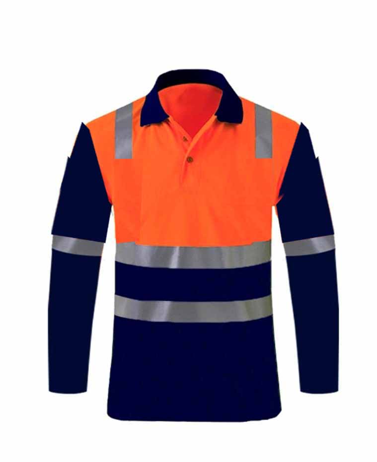 Hi Vis 2 Tone Polo Shirt (LongSleeve)\r Sizes: S - 4XL (size chart)\r Colour: fluorescent yellow n orange - navy blue\r Material\r Retro-Reflective Silver Hi Viz Tape\r 100% Cool Dry Polyester\r Extra\r Collar\r Three button placket\r Cool ‘footbally’ fabric\r This item can be Printed or Embroidered