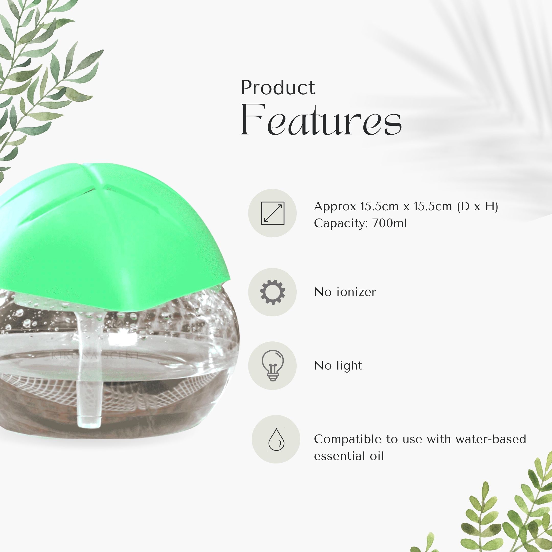 Leaf Purifier is an air purifier/revitaliser which can help reduce dust and smoke particles from your surroundings.It also neutralises microorganisms such as bacteria and germs. Complement it with our Kirona Diffuser Essential Oil to enjoy the air purification and nice aroma in your home.