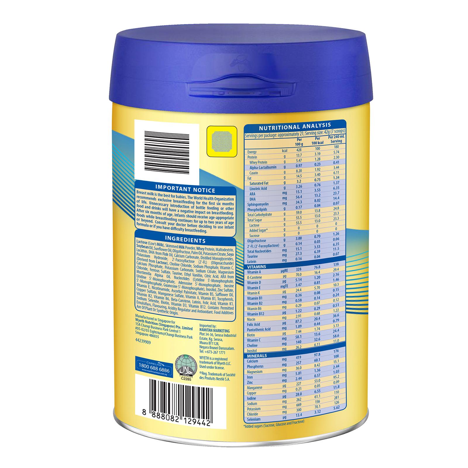 Lactose (Cow’s Milk), Skimmed Milk Powder, Whey Protein, Maltodextrin, Soybean Oil, Sunflower Oil, Oligofructose, Palm Oil, Potassium Citrate, Soya Lecithin, DHA from Fish Oil, Calcium Carbonate, Distilled Monoglycerides, Potassium Hydroxide, 2’-Fucosyllactose (2’-FL) (Oligosaccharide) (Derived from Lactose), Choline Chloride, Sodium Phosphate, Vitamin C, Calcium Phosphate, Potassium Carbonate, Sodium Citrate, Magnesium Chloride, Ferrous Sulfate, Taurine, Ethyl Vanillin, Citric Acid, ARA from Mortierella Alpina Oil, Nucleotides (Cytidine 5'- Monophosphate, Uridine 5’- Monophosphate, Adenosine 5'- Monophosphate, Inosine 5'-Monophosphate, Guanosine 5’-Monophosphate), Inositol, Zinc Sulfate, Vitamin E, Nicotinamide, Ascorbyl Palmitate, Vitamin B5, Safflower Oil, Copper Sulfate, Manganese Sulfate, Vitamin A, Vitamin B1, Tocopherols, Vitamin B2, Vitamin B6, Beta-Carotene, Lutein, Folic Acid, Vitamin K1, Sodium Selenite, Biotin, Vitamin D3, Vitamin B12. Contains Permitted Emulsifiers, Flavouring, Acidity Regulator and Antioxidant. Food Additives Are Of Plant Or Synthetic Origin.